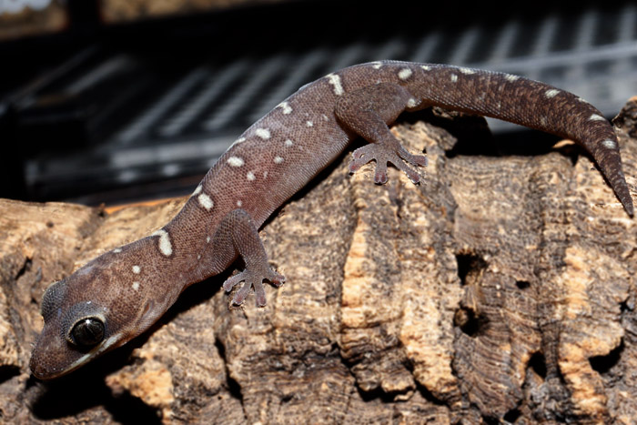根強い人気があるスミスヤモリやシャムヒスイメヤモリと近しい大型のコバンヤモリ属です。地色は濃いめの褐色で、近縁種より白いスポットがくっきり目立ちます。虹彩の色は近縁種に見られる緑系ではなく、琥珀色!