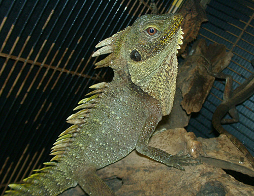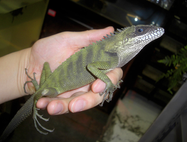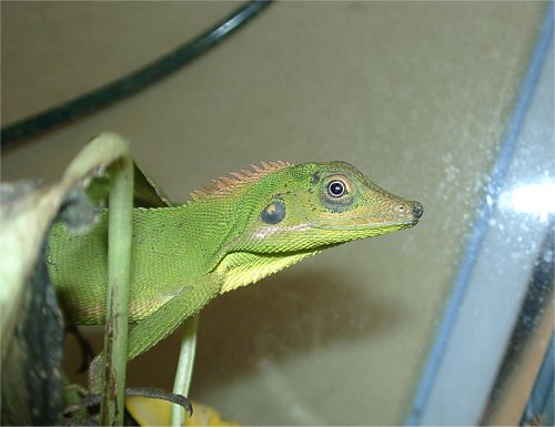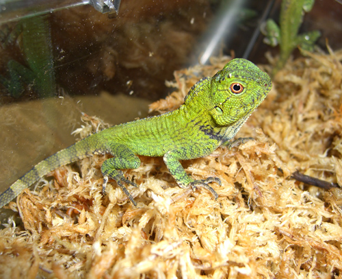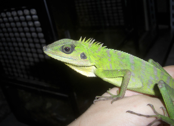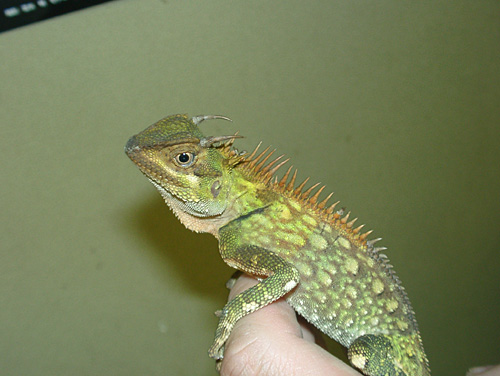 | ベニクシトカゲ(グリーン) | Acanthosaura lepidogaster | 属中では入手難のクシトカゲ。2タイプある色彩の、より人気が高いグリーンベースの方。 ビビッドなイエローグリーンに黒のマスクが精悍な感じ。興奮すると口元から喉までを真っ赤に染めます。機嫌によってはブラウンタイプと見わけが付かないような褐色にもなります(笑)。分布域はそう狭くないのですが、何故かなかなか輸入されません。オスのみ。 |