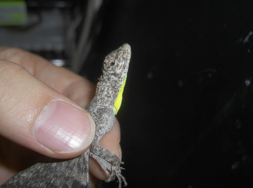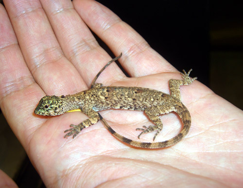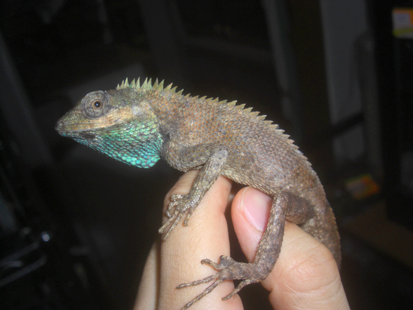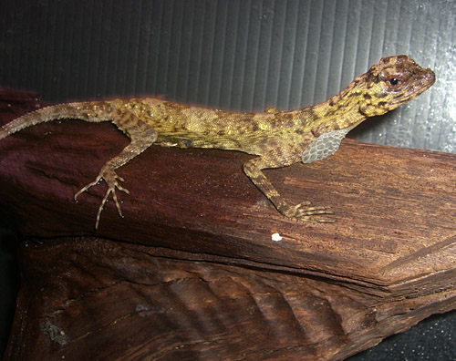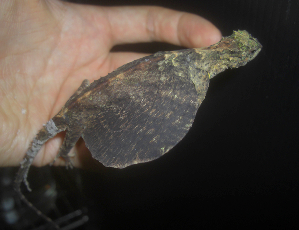 | ナミトビトカゲ | Draco volans | 有名な滑空するトカゲです。普段はいやに胴長な細身のトカゲといった感じですが、自然下では肋骨を羽のように広げ、木から木へとグライダーのように滑空します。実は威嚇にもこの羽を使うことが判明。あと、何だか知らないけど機嫌の良いときもパタパタやってます。更に、雄は顎の下に黄色いフラグが着いています。 |
