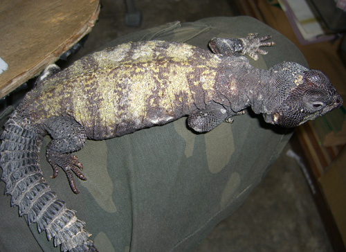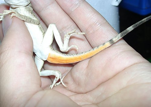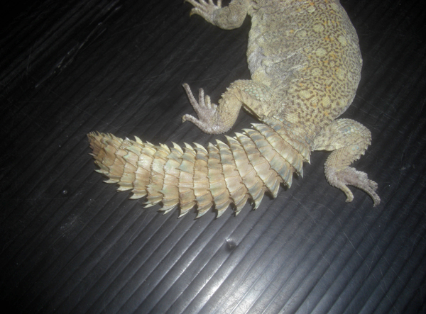 | ディスパートゲオアガマ | Uromastyx dispar dispar | マリトゲオアガマの近縁種。殆ど輸入されません。手足の先が山吹色だったり、頭幅が大きかったり、メスの色彩が鮮やかだったりと色々違います。オスの腹部は完全な虎縞模様。 つーか、デケエ!!何コレ。 本種はどちらかと言えば小型の亜種なのですが、この大きさは何?…重いし(笑)。 オスの尾先、ちょっと欠けています。 残りオスのみ |