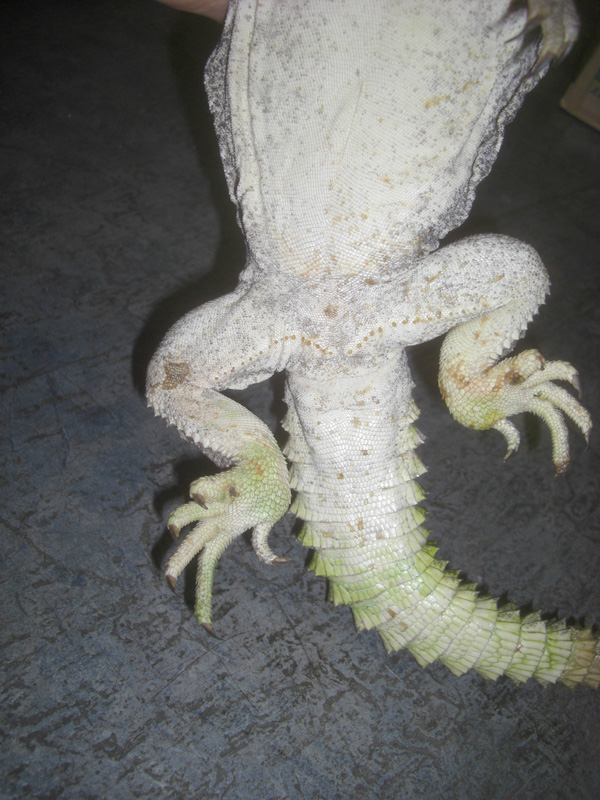 | ニシキトゲオアガマL(ブルー/オス)個体B | Uromastyx ornata ornata | 名の通り色とりどりで、その色合いや模様は個体毎に違うと言っても過言でないほど。半年以上飼い込みの大型アダルトサイズです。 グリーンタイプに引けを取らぬ人気の、メタリックブルーの美しいタイプ。手足や顔周りにはイエローグリーンものって豪華絢爛!背の模様は橙色のブロッチ状です。 後肢に過去指が取れかかった箇所が有ります。現在傷口は完全に塞がっていますが、指先がぐらついています(その状態で治癒しており、指先部が壊死しているわけではないため、先端部の除去を行っていません)。勿論動きや状態には何の支障もなく、状態良好です。 頭部 背 腹 |
