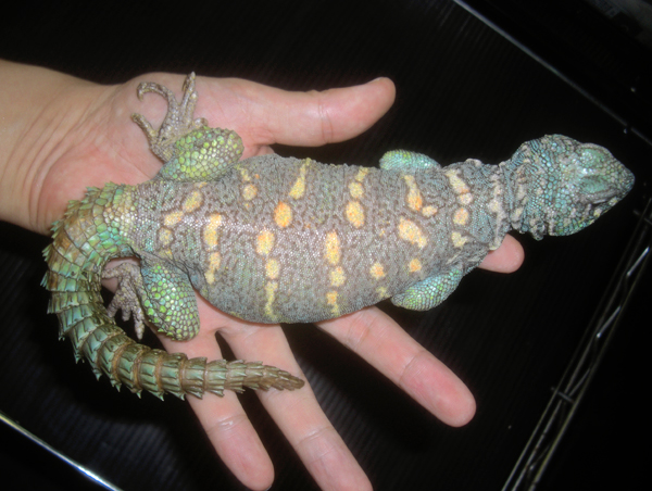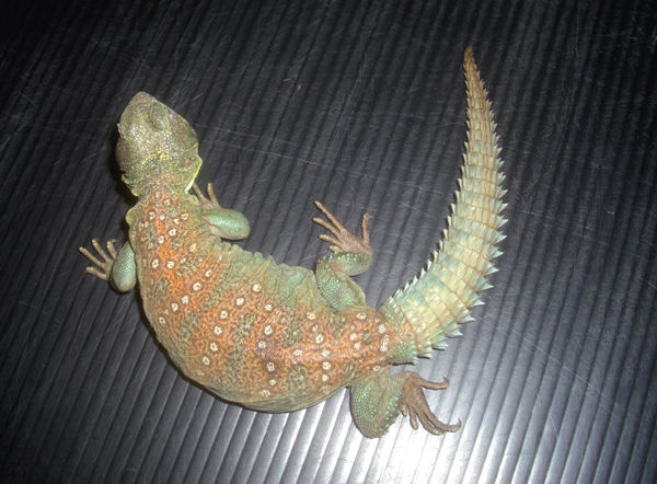 | ニシキトゲオアガマM(グリーン/オス) | Uromastyx ornata ornata | 名の通り色とりどりで、その色合いや模様は個体毎に違うと言っても過言でないほど。これは前飼育者様の飼育開始から日が浅い個体なので、まだ「飼い込み!」という雰囲気ではありませんが、状態などは勿論良好です。 ミドルサイズのわりに発色が素晴らしく、既に頭部や四肢、尾にまでメタリックなグリーンがビッシリのっています。背にはイエローのタイガー模様で脇腹はブルー。これからガンガン食わせ込んで肉付き良く仕上げていけば、より素晴らしい個体になるでしょう。 頭部 背 腹 |
