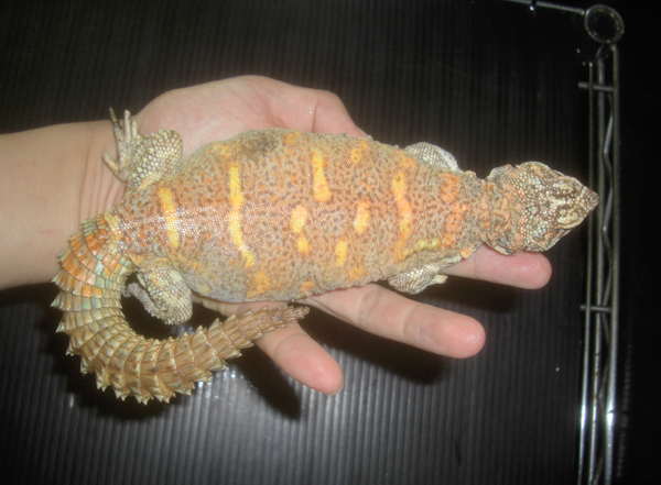 Uromastyx geyri | 綺麗なヤングサイズです。この種は色彩にレッドとイエローの2タイプあり、イエロータイプは成長しきると信じられないくらい全身がまばゆいレモン色になります。既にその片鱗が出始めた良い感じのセレクト個体。脇腹にも黄色が出始めています。今期のゲイリーはどれも状態抜群で、この個体もケージ内を駆け回っています。 |