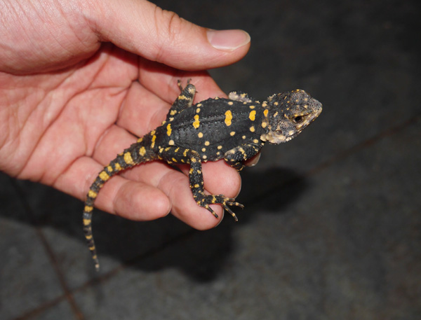 | ステリオアガマ | Laudakia stelio stelio | ハルドンアガマ。三角形の頭部とトゲトゲした外観がイカツイ地上棲アガマ。 亜種と地域バリエーションが豊富な種で、今回のはスタンダードな黒鉄色の体色にイエローの斑紋が背に出る基亜種。 トゲトゲゴツゴツとしており、この類共通の、フトアゴヒゲから一切の愛想を取り去った感じ(笑)が魅力。メチャ丈夫な種で、温度の高低気にせず飼えます。温暖な地域なら周年屋外飼育も可能。 |