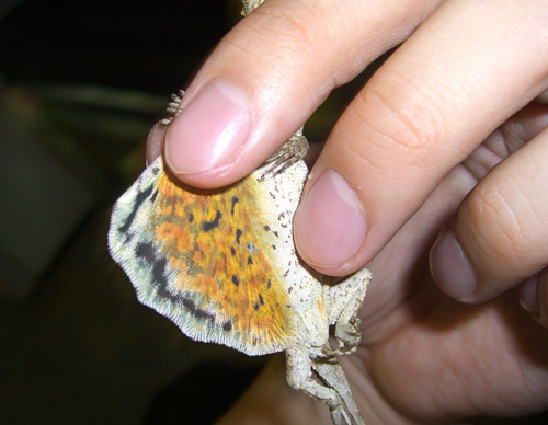| ナミトビトカゲ | Draco volans | 有名な滑空するトカゲです。普段はいやに胴長な細身のトカゲといった感じですが、自然下では肋骨を羽根のように広げ、木から木へとグライダーのように滑空します。実は威嚇にもこの羽根を使うことが判明。あと、何だか知らないけど機嫌の良いときもパタパタやってます。雄は顎の下に黄色いフラグが着いています。 雌雄で羽根の色が違うところは、蝶みたい。 オス羽根 裏 メス羽根 裏 |