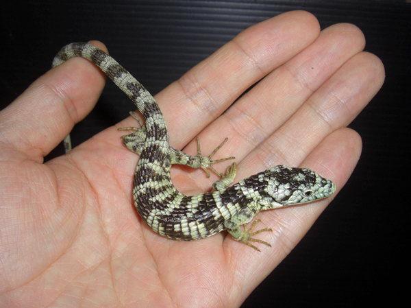 | アリゾナアリゲーターリザード | Elgaria kingii nobilis | 北米産トカゲの中でも、何故かなかなか輸入されてこないアリゲータートカゲ。そのなかでも見かける機会の少ない種です。他種よりスレンダーな体型。1匹のみ入荷。再生尾です。 |