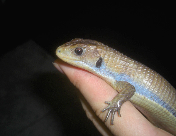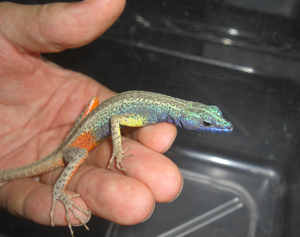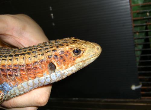 | Tracheloptychus petersi | 結構人気。濃いスカイブルーの頭部と、レッドオレンジのスポットが入る脇腹を持つ、マダガスカル産キレイサンドフィッシュモドキ(笑)。よく見ると後肢には黄色と黒のストライプまで入り、ニシキカタトカゲの名のとおり豪華な色遣い。 砂にも潜るけど、水入れの水にもよく浸かっている変なヤツ。昆虫から果実までなんでもよく食べます。 | |