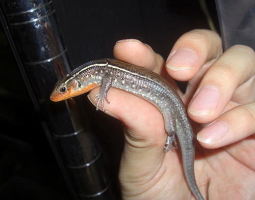 | ブリゴーオビトカゲS | Zonosaurus brygooi | 珍。小型のゾノサウルス。さすがにこれはまだヤング以下のサイズですが、アダルトでも頭胴長9cm前後の小型種です。今回は、マブヤトカゲの中に混じって一匹だけ発見(笑)。 こんなサイズのうちからもう婚姻色が出ており、喉はオレンジレッド。大腿孔もフッサフサしています。つまり、オス。 飼育などは他のゾノサウルスやプレートトカゲ同様、丈夫です。 |