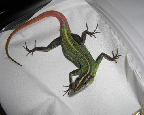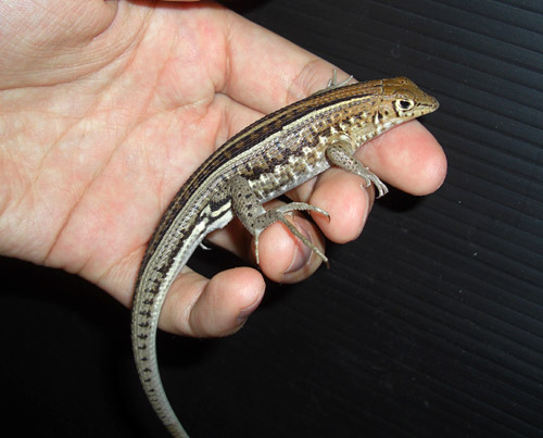 | スジプレートトカゲ | Gerrhosaurus nigrolineatus | アフリカ産プレートトカゲの中でもスレンダーな感じがする種。黄色いラインと脇腹を彩る濃い臙脂色がよく目立ちます。今回の個体は特に色彩鮮やか。丈夫で飼育は容易、しかも安価です。ペア取りOK。 |
