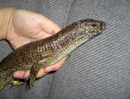 | トウブアシナシトカゲ | Ophisaurus ventralis | 動きの硬いヘビのようなトカゲ。ヨーロッパのアシナシトカゲほど大きくならず、気色悪くない(笑)ので、人気は結構あります。入荷数はいつも少数。 成熟すると、頭部や体側に緑が強く出てきて、別名の「ミドリヘビガタトカゲ」がしっくりくるようになります。そろそろ幼体斑も消え、成体時の緑みをおびた黒鉄色が出始めているサブアダルト。頭も大きくなってきて、なかなかの迫力です。 この種につきもののバッツリ生えたて再生尾ではなく、完尾ではないものの好プロポーション(笑)。 |