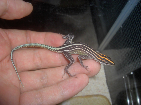 | ヨスジオビトカゲCB | Zonosaurus quadrilineatus | 現地ファーミングCBベビー! これはイイ!まるでテグーのような黒地に金縁の配色と、コロンとした体格。顔つきだってこんなに可愛い(もともと本種は黒目で可愛い顔してますが)。 床材に潜ったりパタパタ走ったり、行動だってメチャ可愛いですよ! 餌食いも良く元来丈夫な種なので、初心者にもお勧め。チビサイズから手に慣れさせれば、手乗りゾノサウルスも夢じゃない。残1匹のみ |
