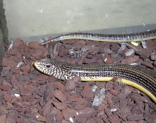 | トウブアシナシトカゲS | Ophisaurus ventralis | 動きの硬いヘビのようなトカゲ。ヨーロッパアシナシトカゲほど大きくならず、気色悪くない(笑)ので、人気は結構あります。 まだ顔に幼体斑の残る小さいサイズ。成体では体色が緑がかって、体つきも意外なほどがっしりして迫力を醸し出します。 この種につきもののバッツリ生えたて再生尾ではなく、完尾の好プロポーション(笑)個体。 |