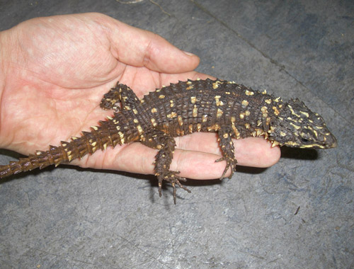 | ジンバブエヨロイトカゲ | Cordylus rhodesianus | ローデシアヨロイとも。大人気のミニアルマジロトカゲです。大分久しぶり感があります。今回は持ち腹CBを育てた飼い込み。ちょっと尾先が欠損してますが、他は問題なしです。 尾のトゲトゲ感が際だち、全体的に平たい種です。頭部も扁平。丸まると本当にアルマジロトカゲのよう。 |