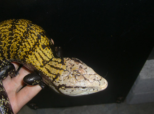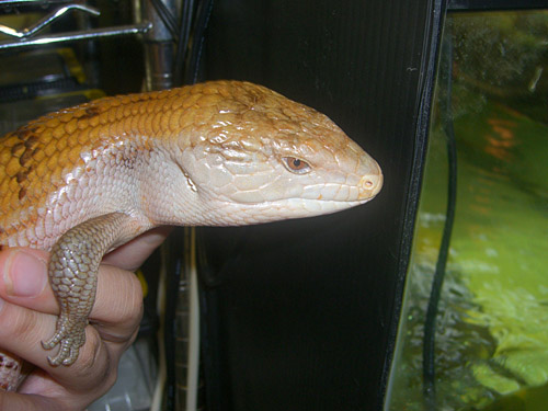 | キメラアオジタトカゲ(ゴールデン) | Tiliqua scincoides chimaerea | 太短い体型で、チュウオウアオジタを除けば最もツチノコっぽい体型のアオジタ。金属光沢が出るのが特徴で、この個体は地色に美しいゴールドが発色した個体。喉元や腹部は金属光沢のあるオレンジが強く、色合い豊かです。 全体的にキメラアオジタは気が荒いですが、この個体は掴むときに噴気音こそ上げるものの、噛みついたりせず比較的大人しく手の上に載ります。 頭部 背部 |
