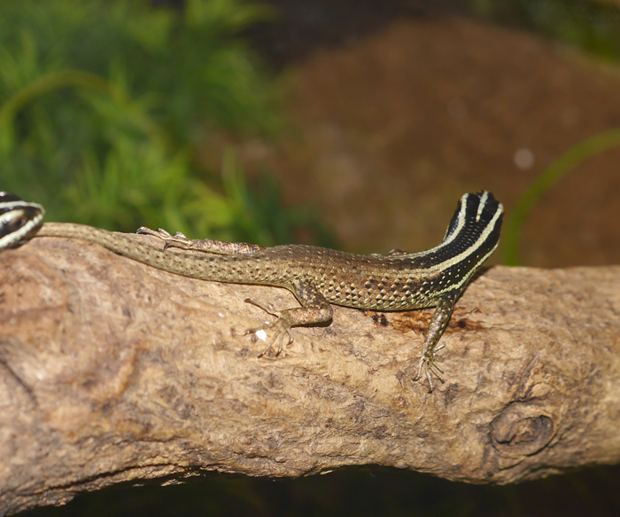 | フタスジマブヤ | Trachylepis striata | ストライプマブヤ。和名はデブスジマブヤ(笑)。縦に明暗のストライプが走るやや小型のマブヤトカゲです。 雄は成熟すると喉元が真っ赤になります。 |