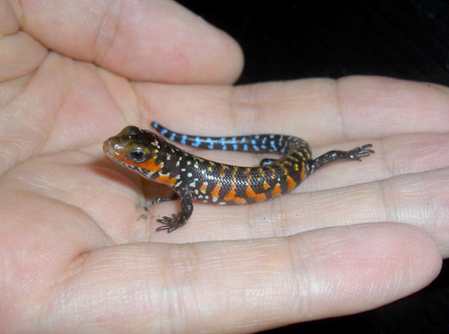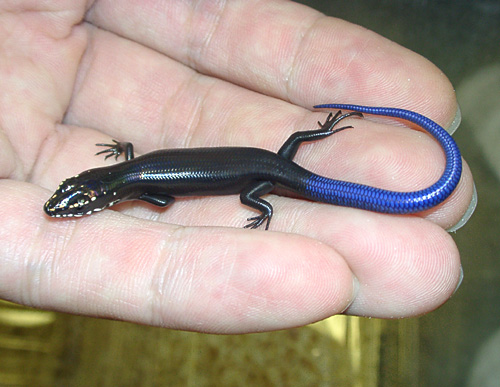 | フロリダファイブラインスキンクMS〜S | Plestiodon inexpectatus | マガイイツスジトカゲ。ニホントカゲとよく似た感じのアメリカ産スキンク。 非常によく似たコモンファイブラインスキンク(イツスジトカゲ)は時折見かけますが、本種はあまり流通しません。 コバルトブルーの尾が非常に鮮明なアンセクシュアルサイズ。メスはかなり育つまで残ります。 |