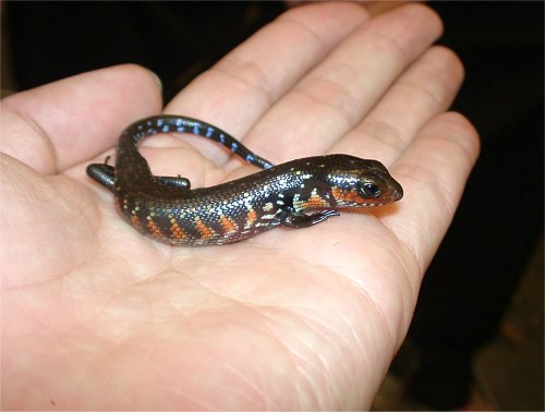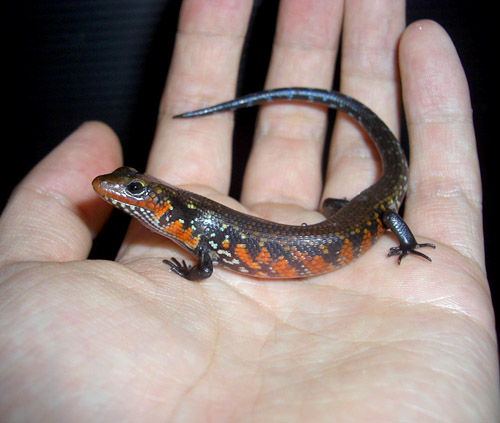 | シュナイダースキンク | Eumeces schneideri | 久々入荷!蛍光オレンジの斑点がよく目立つ丈夫な中型スキンク。色合い色々。飼い込むとなかなかの迫力が出てきます。存在感有るスキンクです。 スキンク系特有のミサイルのような動きをしないので、小柄なアオジタ感覚で飼えます。餌にもうるさくなく、昆虫からピンクマウス、果物、ふやかした配合飼料、ゼリーなど何でも食べます。 店主お勧めの中型地上棲スキンク。今回のは特に良いよ! |