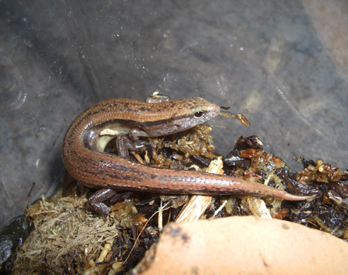 | シジミマブヤ | Eutropis macularia macularia | 実に久々!お勧めの小型の地上棲スキンク。他のマブヤよりずっと小柄で、アダルトでも10cmくらい。オスはメスより派手な体色で、喉の下が真っ赤に染まります。 ジメジメしない程度に多少湿気のある床材を敷いて飼いましょう。この時期はメスの持ち腹も狙えます。卵ポコポコ産んでよく殖えますよ。 いつの間にかMabuya属じゃなくなってたので、厳密に言うとシジミ「マブヤ」じゃないんですけどね…。 |