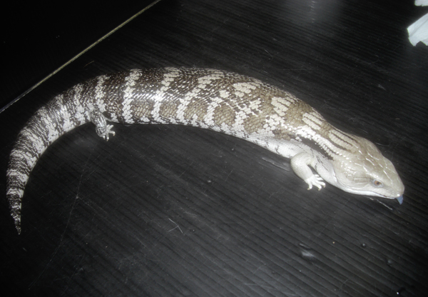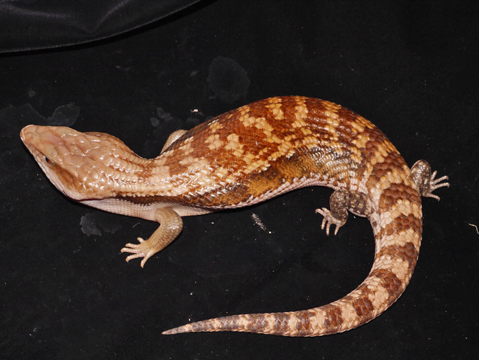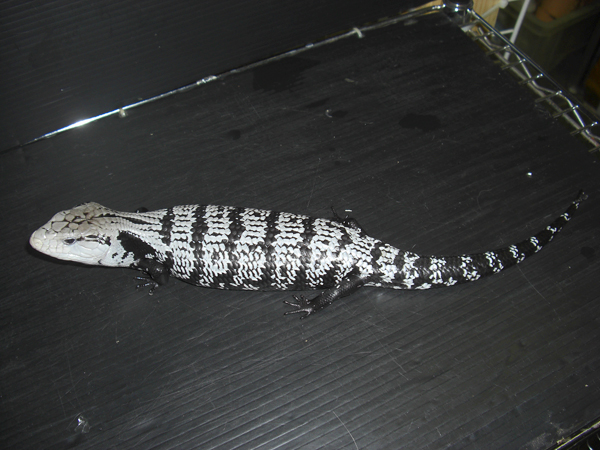 | キタアオジタトカゲ | Tiliqua scincoides intermedia | CB飼い込み大型個体。脇腹にキタ特有のオレンジ&黒のバンド模様がくっきり出た典型的な美個体。 ハンドリングしても怒ったりしない良く慣れた個体です。好き嫌いせず何でも食べます。優秀なペットリザードです。 |