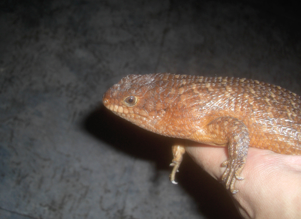 | モモジタトカゲCB | Hemisphaeriodon gerrardii | EUCB飼い込み。ベビーより育てられて、何でもよく食べる(本種は時折コオロギを嫌がる個体もいますが、コイツはOK)安心サイズです。人慣れしているのか物怖じせず、オープンな場所でよく日光浴をしています。スキンク系の飼育にあたってこれは嬉しい。 ハンドリングすると長い尾をゆったりと指に巻き付け、アオジタトカゲの近縁種でありながらその動きは全く別モノ。言われているとおり、ゆったりした動きのアリゲーターリザードといった雰囲気。木などにもよく登るので、レイアウトして飼うのも良いでしょう。 成長に連れ、頭部にボリュームも出てアオジタに近い感じになっていきます。 |