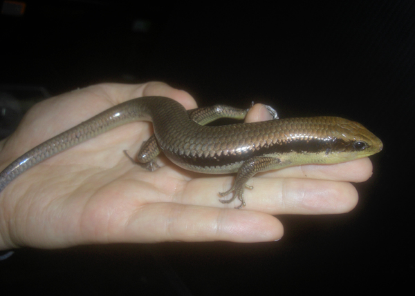 | イエローベリーモールスキンク | Eumeces taeniolatus | ジムグリトカゲ。オセラータスキンクなどカラカネトカゲの仲間を思わせる、つるつるしのっぺりした細長いトカゲ。 黄色い腹部と尾の細かいテクスチャが意外と派手です。 |