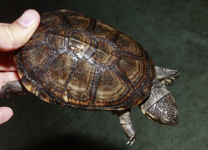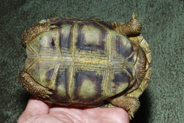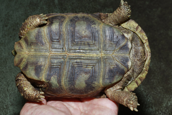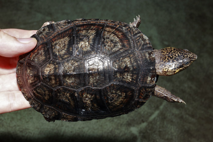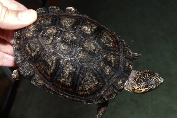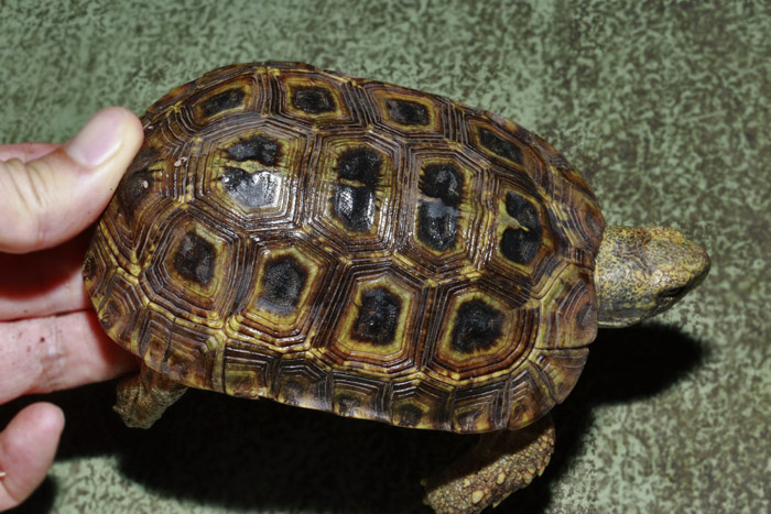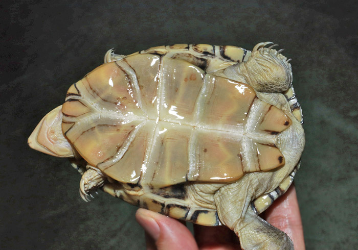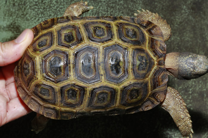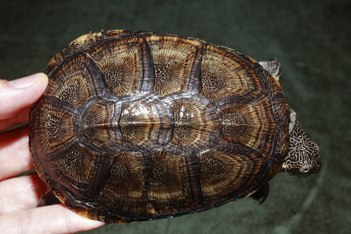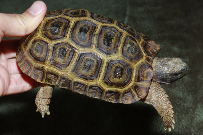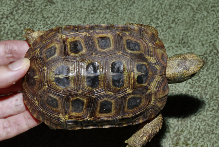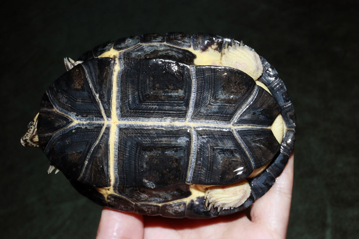 Terrapen carolina triunguis | 国内CB 血統や個体差によってアメリカハコガメの中でも相当なバリエーションがあるミツユビ。最も入手し易いながら、最も奥が深いと言っても過言ではないでしょう。 模様の傾向はまだ不明な現段階から地色の濃淡や柄の素も個体により様々で、どのような方向に育っていくか楽しみ! これは既にくっきりとした花火柄が多数出ている有望な個体です。 指で輪を作ったくらいのしっかりサイズ幼体。 性別不明 腰部 背甲 腹甲 |