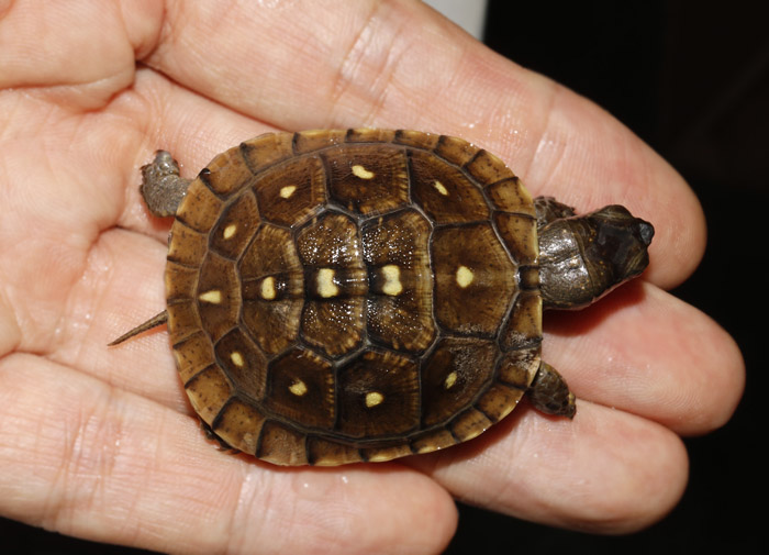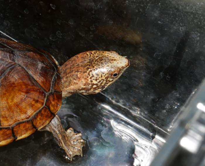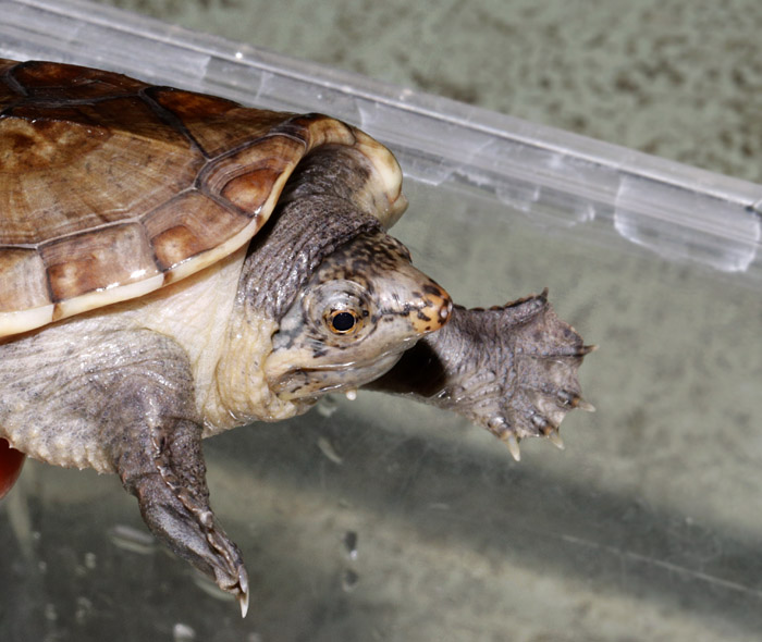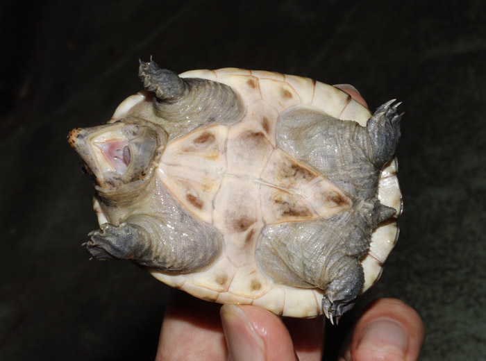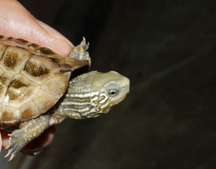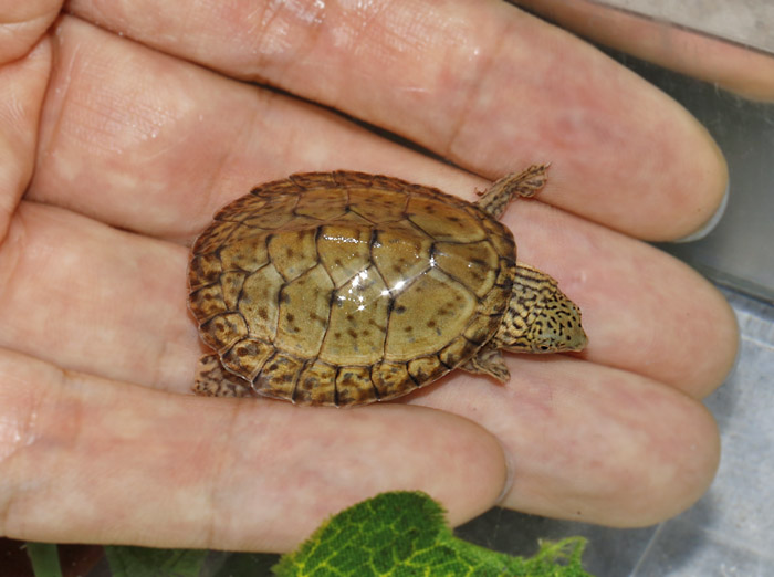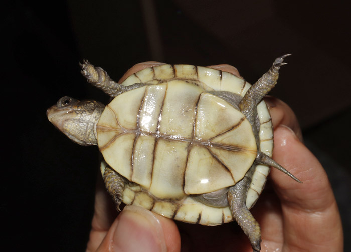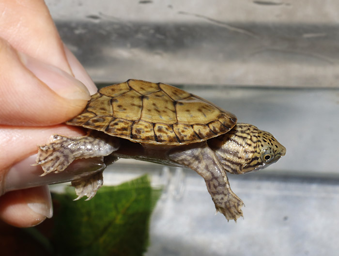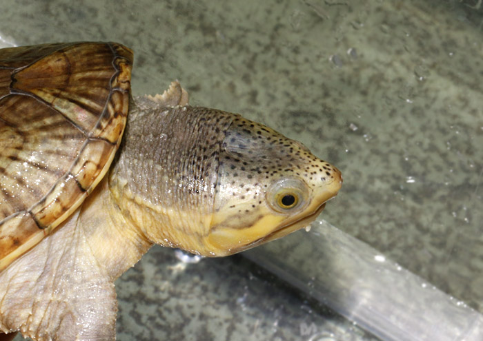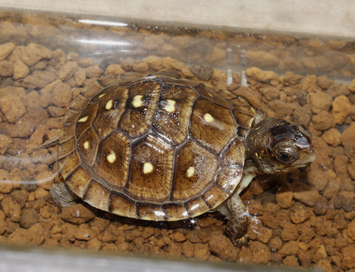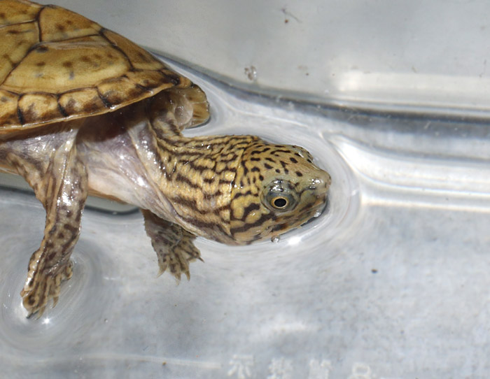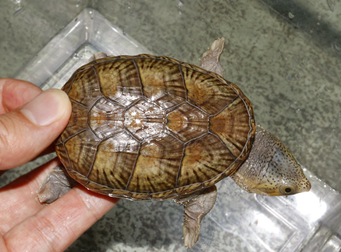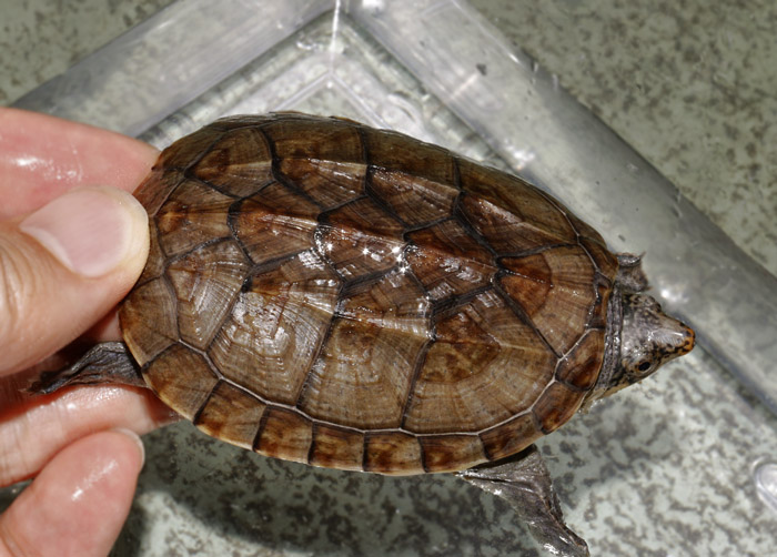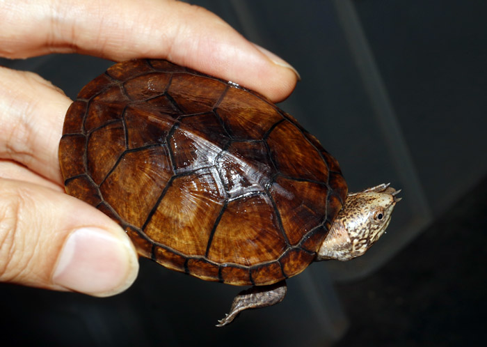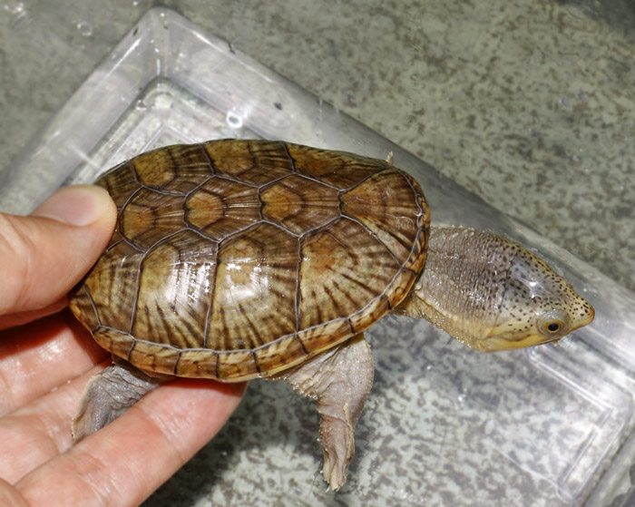 | スッポンモドキ | Carettochelys insculpta | 一科一属一種という、他に類を見ない姿形をした独特なカメです。 スッポン類によく似た姿ではありますが、甲の骨格自体はしっかりと形成されており、特に幼体時は背の正中線上に竜骨状の骨が目立ちます。 スッポン類と違い手足は完全にオール状になっており、基本的に上陸はせずに生涯を水中で過ごします。 ブタの鼻に例えられるシュノーケルのような吻端など、本種ならではの特徴が満載。広い水槽でしっかり泳がせて飼育したいですね。 掌大のSMサイズ。 頭部 背甲 腹甲 |