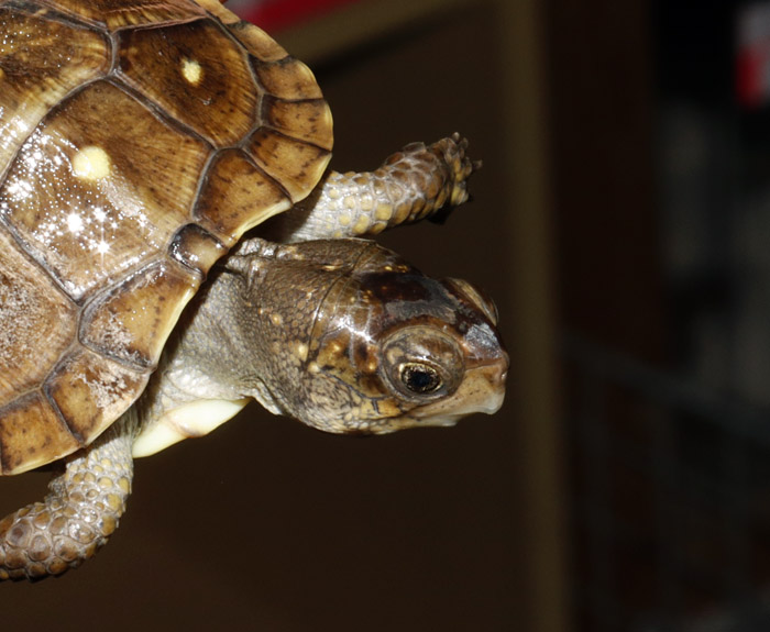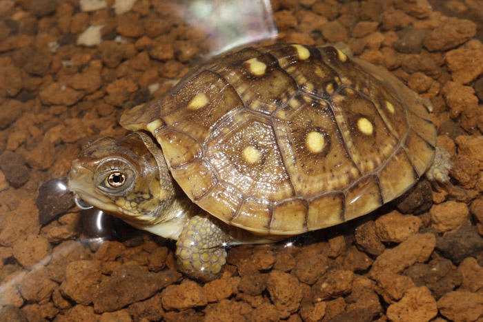 | セネガルフタスッポン | Cyclanorbis senegalensis | ハコスッポンのように甲にフタをすることが出来るアフリカ産のフタスッポンです。 ドーム型の甲を持つハコスッポンとは違い、体型は普通のスッポンと同じく薄くのっぺりしているのに、頭を引っ込めると前後のエンペラが蓋のように閉じる不思議な作りになっています。前から見るとどら焼きみたい! 通常は無地か薄いスポット程度の地味な色合ですが、この個体は暗色のドット柄がわりと背にしっかり出ています。 配合飼料もよく食べるスッポンなので、飼育は容易です。 大人の掌部分(指含まず)くらいの、大きすぎず小さすぎずな良いサイズ。WCなのに細かな傷も無く非常に綺麗! 頭部 背甲 腹甲 |